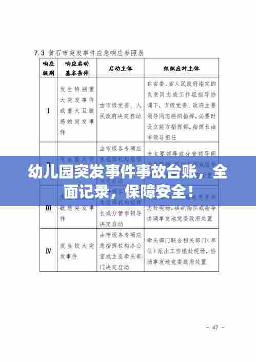 幼儿园作为儿童学习和成长的重要场所,其安全问题一直备受关注,为了有效应对幼儿园中可能发生的各类突发事件事故,建立一个完善的“幼儿园突发事件事故台账”显得尤为重要,本文将就幼儿园突发事件事故的台账进行详细阐述。