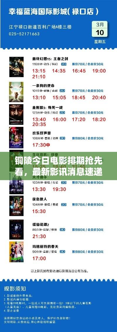随着电影市场的繁荣,观众们对电影的热情日益高涨,铜陵的影迷们也不例外,纷纷关注着最新的电影动态和影讯消息,本文将为大家带来铜陵今日影讯的最新消息,以便大家了解并安排观影行程。